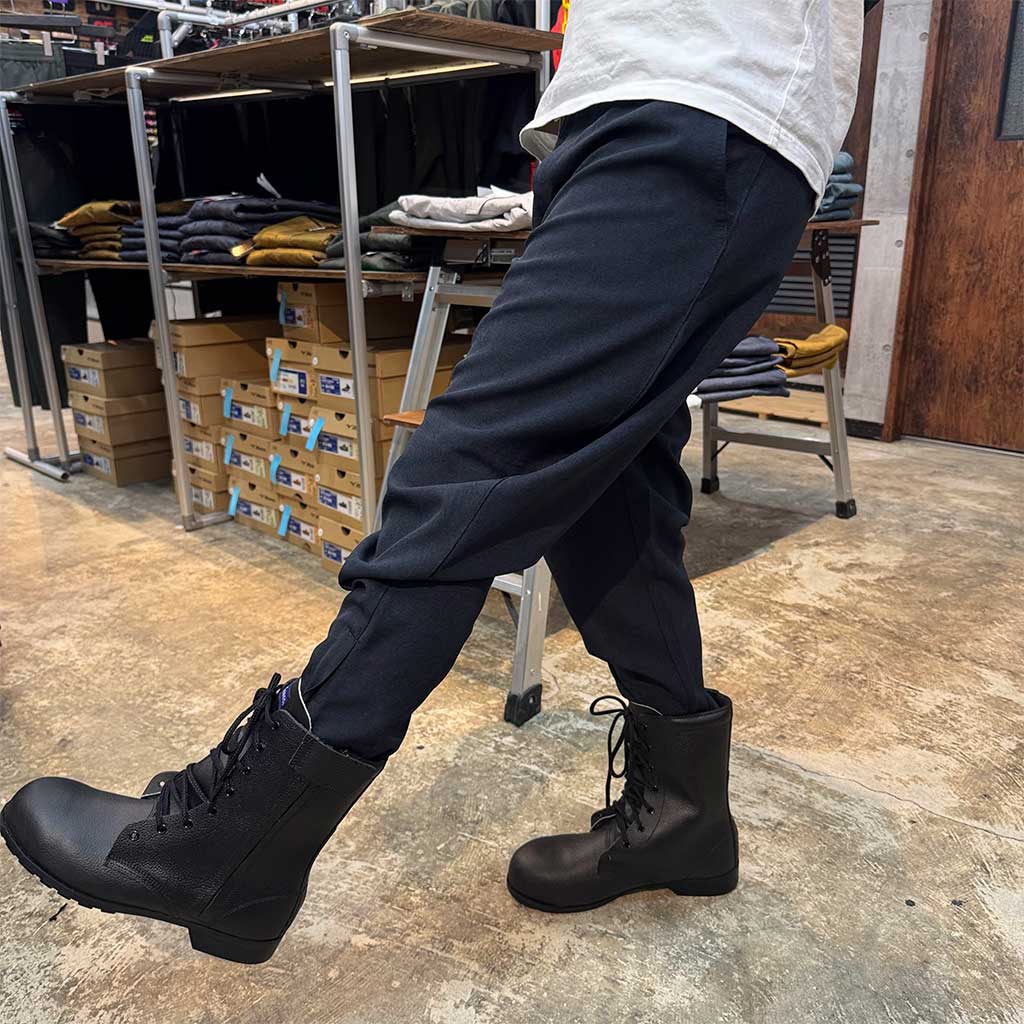 - メリット③:「地下足袋」や「安全靴」との相性が抜群 裾が細いため、職人さんがよく履く地下足袋や、編み上げの安全靴、長靴の中にズボンの裾をスッキリと収納(イン)することができます。布がダブつかないので、靴の中でゴロゴロして痛くなることがありません。